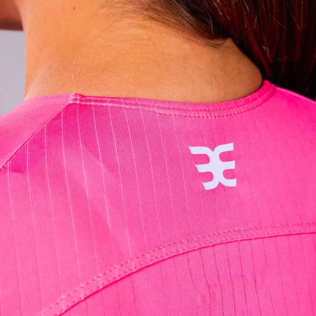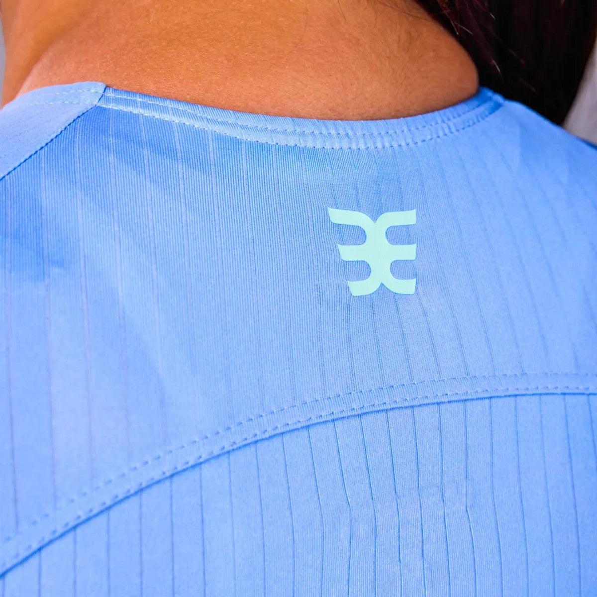 A parte superior, em Tech Square®, alia leveza, secagem rápida e excelente respirabilidade, características que elevam o conforto térmico durante a corrida e nas transições. Já as mangas em Wind Skin® favorecem a aerodinâmica e protegem contra o vento, contribuindo para a performance nos trechos mais velozes.