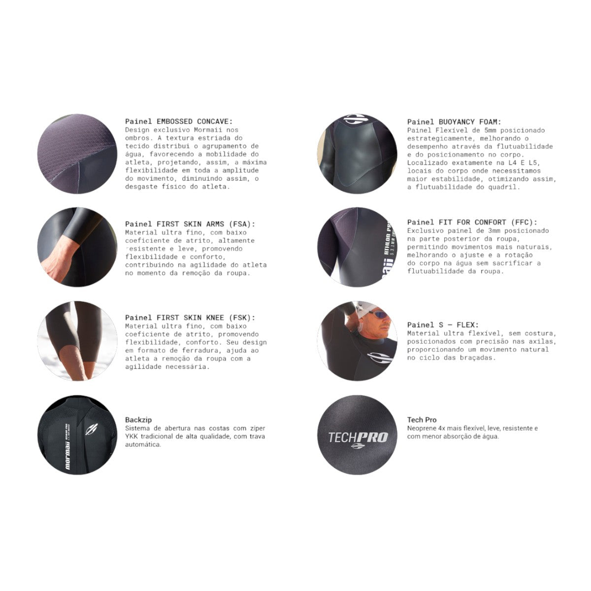 Painel EMBOSSED CONCAVE: Design exclusivo Mormaii nos ombros. A textura estriada do tecido distribui o agrupamento de água, favorecendo a mobilidade do atleta, projetando, assim, a máxima flexibilidade em toda a amplitude do movimento, diminuindo assim, o desgaste físico do atleta.